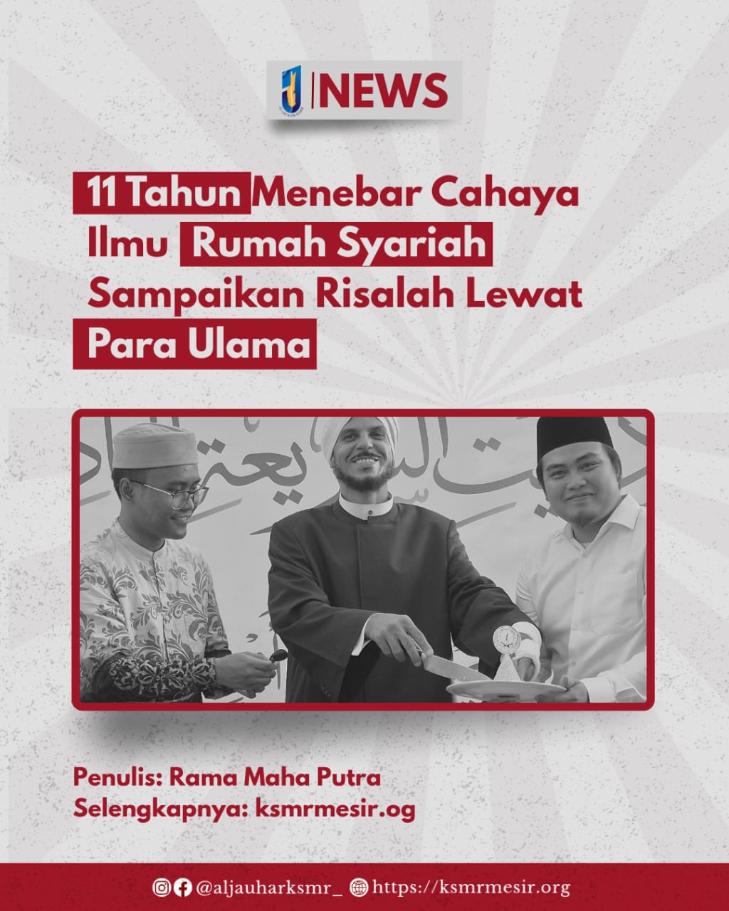Ksmrmesir.org (6/8) — Dalam balutan semangat ilmu dan ukhuwah, Rumah Syariah (Rsa) memperingati milad ke-11 dengan penuh khidmat dan kebahagiaan. Bertempat di Aula Masjid As-Salam, Hay Asyir, Kairo, perayaan ini menghadirkan dua tokoh ulama terkemuka sebagai tamu spesial dan pemberi nasihat (wa’idzh), yakni Maulana Syekh Husam Ramadhan dan Maulana Rif’at Fauzi Abdul Muthalib. Momentum milad ini menjadi ruang mempererat ukhuwah antara anggota, pengurus, dan alumni Rsa lintas generasi.