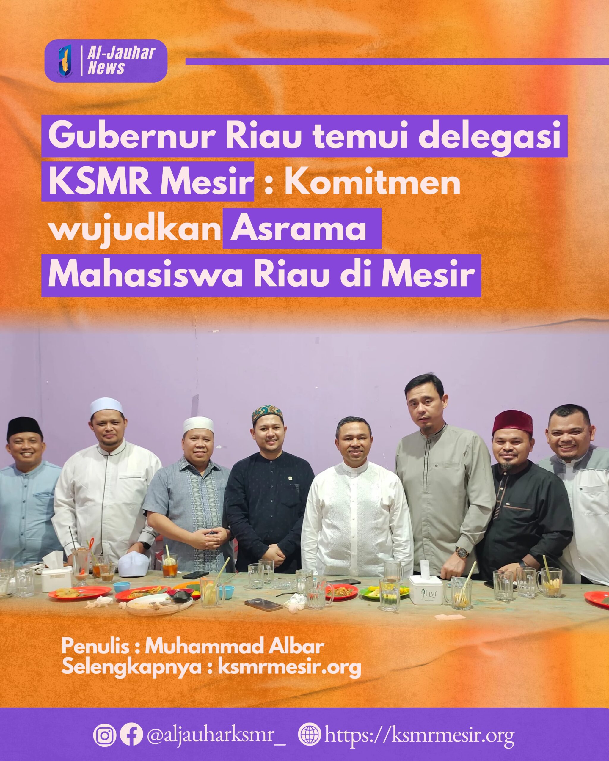 Ksmrmesir.org — Ahad, 23 Ramadan 1446 H atau bertepatan dengan 22 Maret 2025, menjadi momentum bersejarah bagi mahasiswa KSMR Mesir. Pada malam yang penuh berkah selepas salat Tarawih, pertemuan perdana antara delegasi mahasiswa KSMR dan Gubernur Riau terpilih, H. Abdul Wahid, S.Pd.I., M.Si., berlangsung secara langsung di sebuah tempat khusus dan tertutup. Pertemuan ini menjadi wujud nyata komitmen dan perhatian khusus dari beliau terhadap aspirasi mahasiswa KSMR Mesir. Turut hadir dalam kesempatan tersebut Ketua Tim Koordinasi Pengadaan Asrama Riau di Mesir Budi Afriyandi LC., Diplom., Ketua Yayasan Tabung Waqaf Ummat Ustadz Alnofiandri Dinar Lc., Wakil ketua Baznas Jamaluddin, S. Ag, M. Sy., Pimpinan pondok pesantren Nurul Azhar Kyai Dr. Muhammad Hanafi M. Sy.