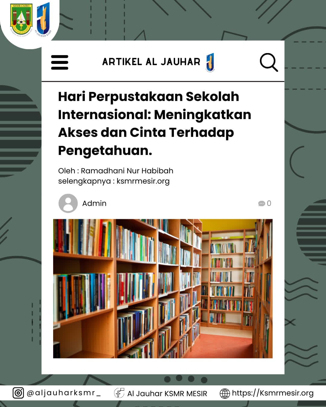 Ksmrmesir.org (18/10) – Hari Perpustakaan Sekolah Internasional atau International School Library Day adalah sebuah hari perayaan yang diperingati setiap tahun pada tanggal 18 Oktober. Dikutip dari laman dunia perpustakaan.com, peringatan ini pertama kali diadakan pada tahun 1999 dengan tema ‘A Day In The Life’.