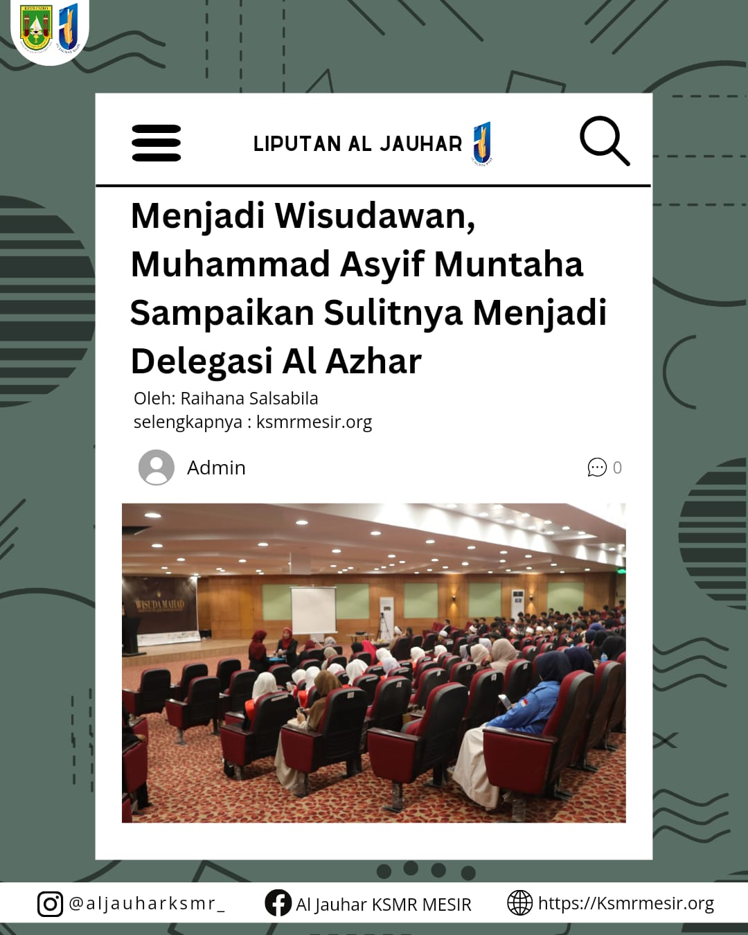 Sebanyak 16 wisudawan/wisudawati berjalan teratur saat prosesi wisuda berlangsung. Muhammad Asyif Muntaha mewakili para Wisudawan menyampaikan pidatonya dalam dua bahasa. “Perayaan ini digelar bukan lain sebagai rasa syukur kita kepada Al-Azhar as-Syarif dan masyaikhnya, juga sebagai pengingat bahwa kita adalah delegasi utusan Al-Azhar yang akan mendedikasikan diri dan membawa nama besar ini ke kampung halaman masing-masing,” ungkapnya.