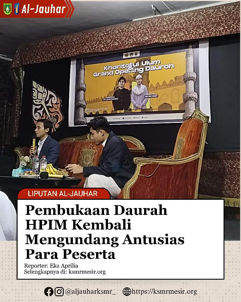 Ksmrmesir.org (16/11) – Himpunan Pelajar Indonesia Ma’had (HPIM) sukses gelar acara Khoritotul Ulum dan Grand Opening Daurah pada Jumat (15/11) di Aula Pasanggrahan KPMJB Mesir.