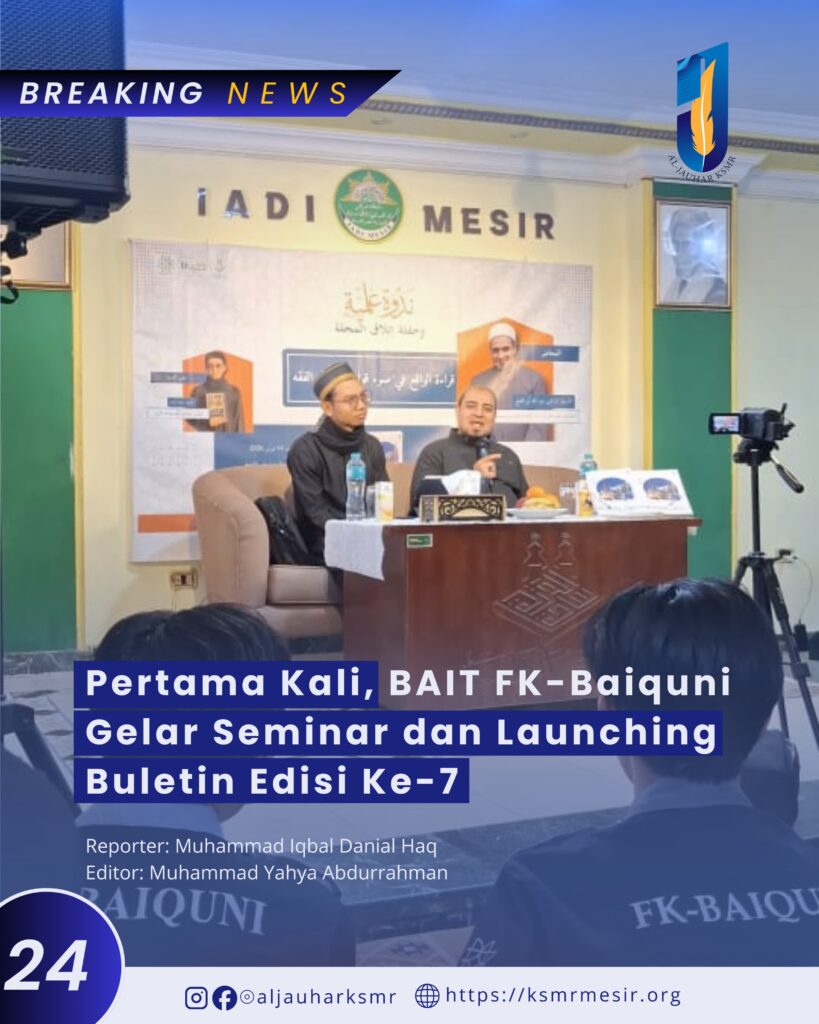 Ksmrmesir.org—Sabtu (14/02), telah diadakan Seminar Ilmiah dan Launching Buletin Edisi ke-7, yang diselenggarakan oleh BAIT FK-BAIQUNI. Kegiatan ini berlangsung di Sekretariat IADI dengan menghadirkan Al-Ustaz Dr. Abdullah Abu Al-Fath sebagai pemateri, dan Ustaz Muhammad Sa’id Anwar sebagai moderator.