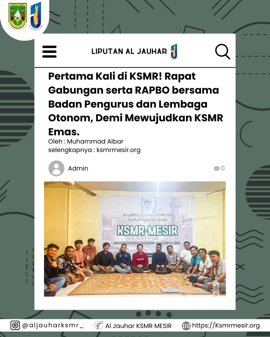 Ksmrmesir.org – (Cairo, 16/10) Badan Pengurus dan Lembaga Otonom KSMR bersama Dewan Konsultatif adakan rapat gabungan untuk membahas Rencana Anggaran Pengeluaran Biaya Organisasi (RAPBO) selama setahun mendatang.