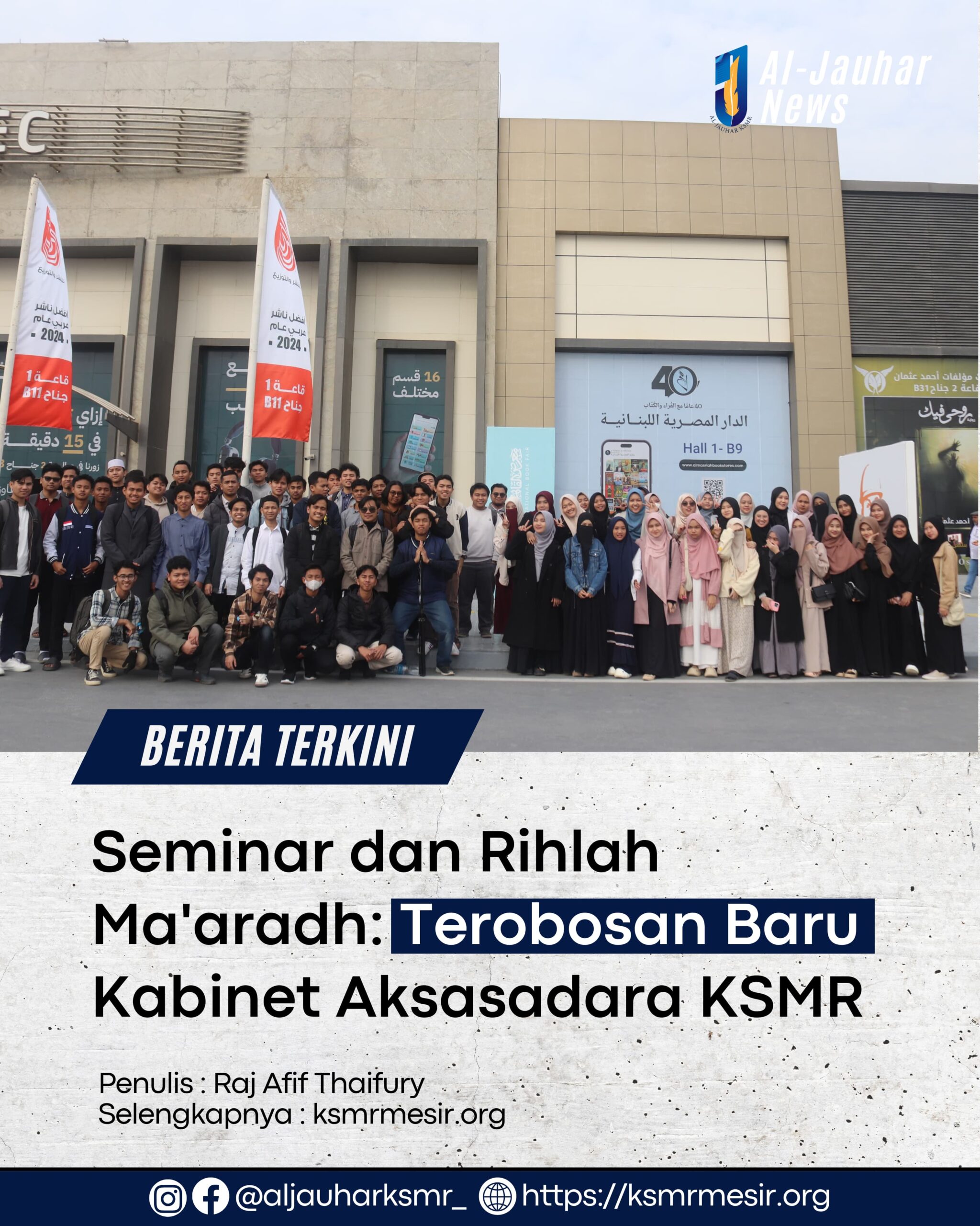 Ksmrmesir.org – (28/1) Badan Pengurus KSMR, berkolaborasi dengan Lembaga Otonom Al Jauhar, sukses menyelenggarakan seminar dan rihlah ma’aradh yang menjadi terobosan baru di bawah kabinet Aksasadara. Kegiatan ini berlangsung pada 28 Januari dan mendapatkan sambutan hangat dari warga KSMR maupun non-KSMR.