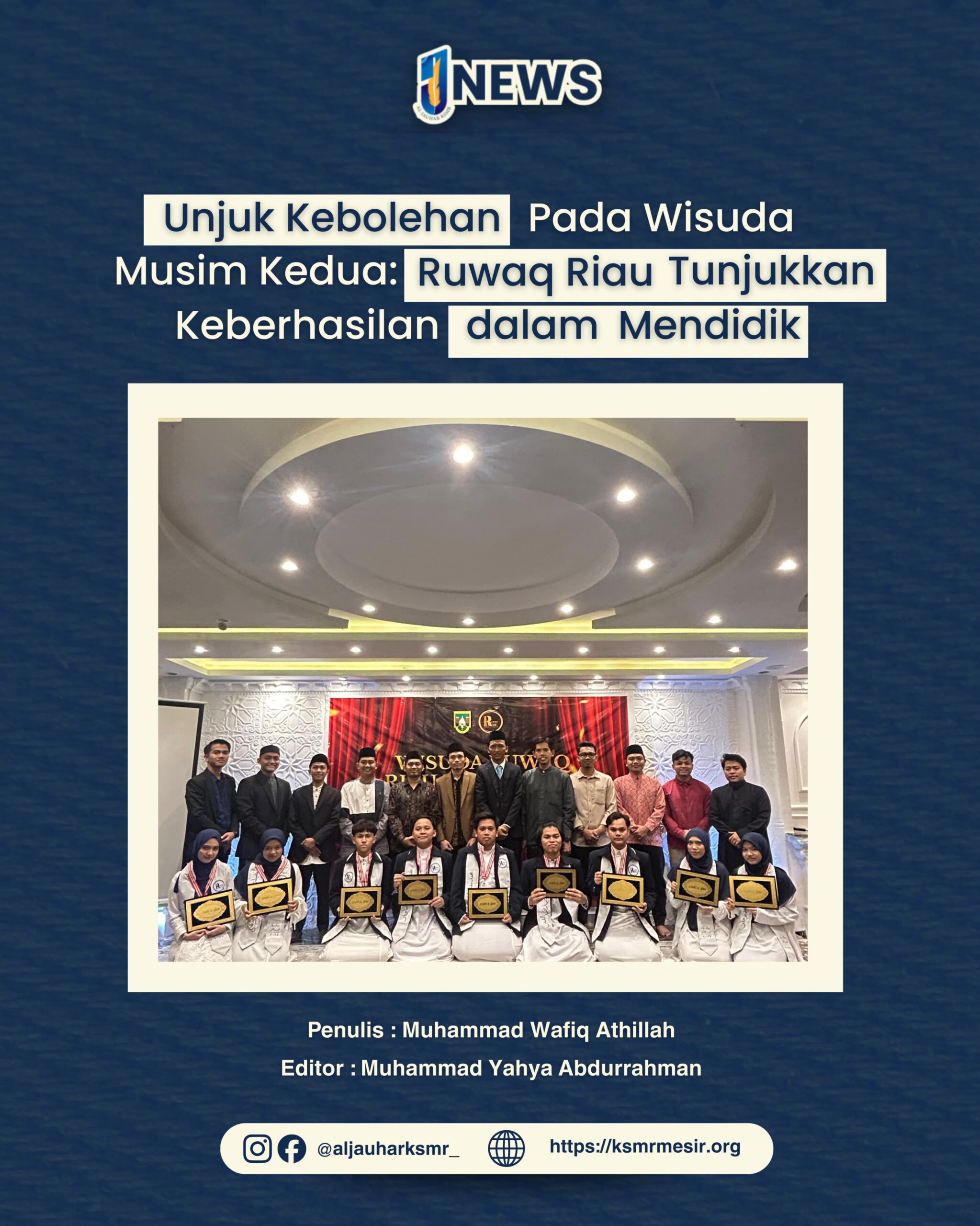 ksmrmesir.org — Ruwaq Riau kembali menunjukkan keberhasilannya dalam membina para pelajar melalui Wisuda Ruwaq Riau Musim Kedua. Keberhasilan tersebut terlihat jelas dari kemampuan para wisudawan menjawab berbagai pertanyaan penguji dalam sesi demonstrasi yang digelar pada Senin (24/11). Momentum bersejarah ini turut dihadiri oleh Gubernur dan Wakil Gubernur KSMR, Dewan Konsultatif KSMR, serta para tamu undangan.
